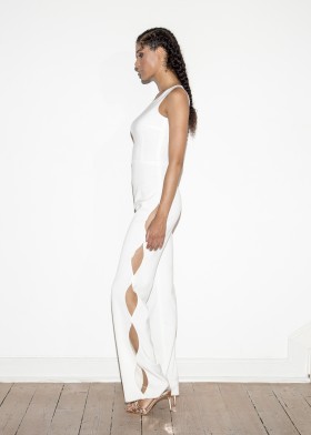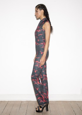 Ärmelloser, figurbetonter Catsuit aus mehrfarbiger, grafischer Matrix-Paillettenspitze geschlitztem Dekolleté und langen halbtransparenten Beinen