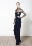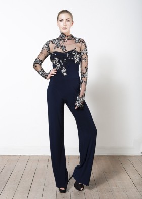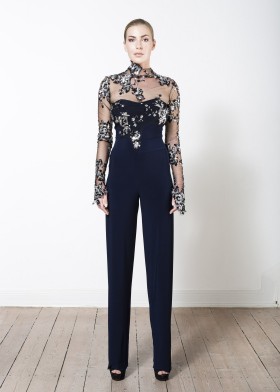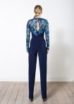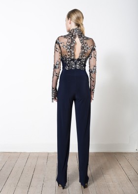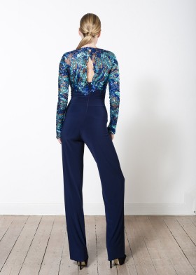 Catsuit aus Wollsatin Stretch mit langem, geschlitzem Arm & locker fallendem Bein.