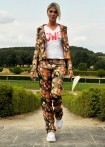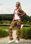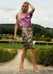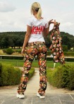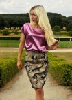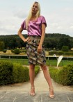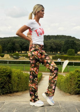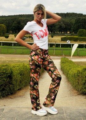 Kurzärmeliges, weißes T-Shirt mit Power Woman Schriftzug in pink-orange und Lurexnähten