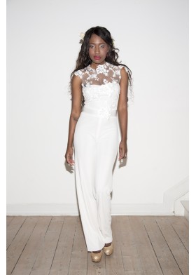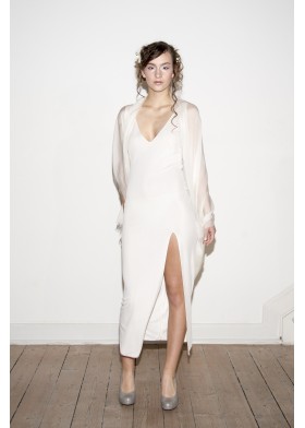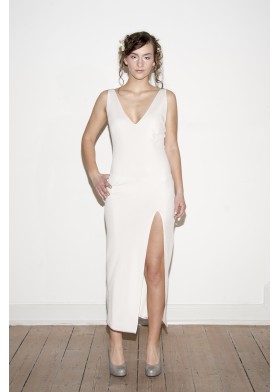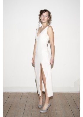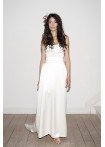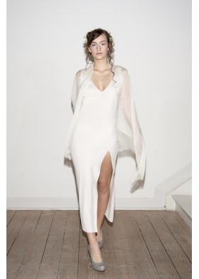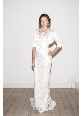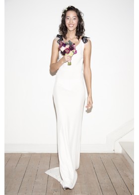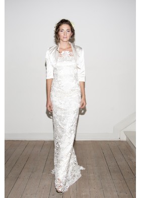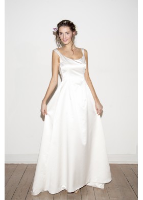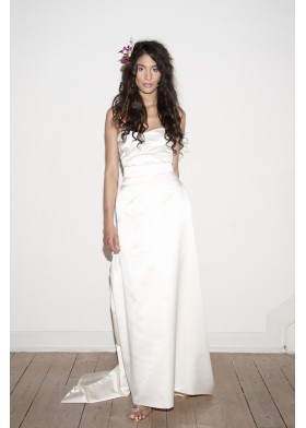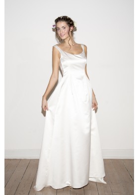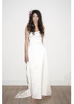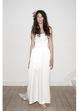 Langer, puristischer Duchesse Rock mit Bund und Schleppe und Hackenverschluss im Rücken