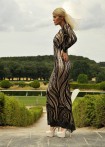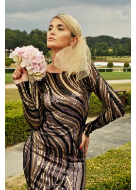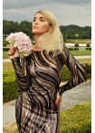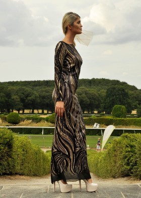 Langes Universe Dress mit dynamischer, mehrfarbiger Paillettenstickerei und Satinstretch-Unterkleid