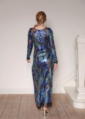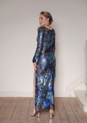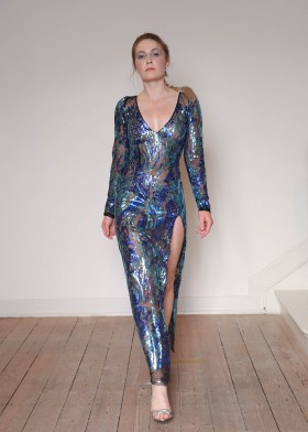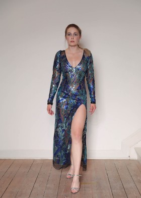 Langes Kleid aus Couture Spitze in Meeresfarben mit hohem Beinschlitz, langen Ärmeln und V-Ausschnitt