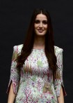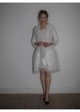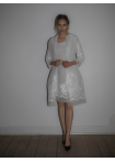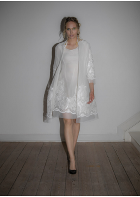 Feenspitzenkleid mit zarten Blütenranken, halbtransparentem Dekolleté und durchscheinend bestickten Dreiviertelärmeln, unterlegt mit einem Bustierkleid aus Nude Satin Stretch
