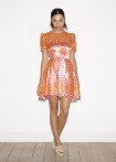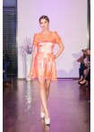 Millefleur-Spitzenkleid mit Puffärmeln in orange-pink Tönen mit Volantrock und mit Bustier-Satinkleid unterlegt in Rosenholz