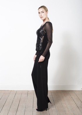 Stylen Sie den Jumpsuit idealerweise mit unserer veganen Felljacke in Schwarz und High Heels. Kombinieren Sie ihn alternativ für einen besonders extravaganten Auftritt mit einem schwarzen Spitzendiadem, welches aus der passenden Couture Spitze gefertigt wird.