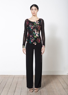 Raffinierter Jumpsuit aus Crêpe-Jersey mit Blüten-Spitze besetzt und seitlichem halbtransparentem Cutout