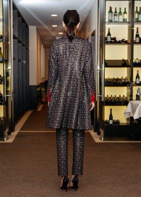Diese lange, schmal geschnittene Hose überzeugt durch Eleganz und Tragekomfort. Die Hose besteht aus bi-elastischem Stretch Stoff mit mehrfarbigem Tweed-Print. Die gedeckten Farben Schwarz und Silber werden durch rote High Lights vervollständigt. Wenn Sie nach einer aufregenden Alternative zur klassischen schwarzen Hose suchen, treffen Sie mit der Tweed-Print Hose aus Alcantara-Stretch die perfekte Wahl. Der schmale Schnitt und das gerade Bein sorgen dafür, dass Sie dazu hohe Schuhe als auch Sneaker oder Stiefeletten kombinieren können. Der Schnitt betont Ihre Beine vorteilhaft. Die abgesteppte Bügelfalte sorgt jederzeit für den perfekten Sitz. Wählen Sie für einen Statement-Look dazu unser rotes, gerafftes Jersey-Shirt und unseren passenden Tweed-Print Mantel. Oder kombinieren Sie dazu für einen elegant-lässigen Alltagslook unser schwarzes Rolli-Shirt und farblich passende Sneaker.