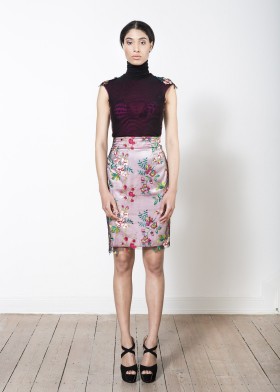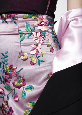 Bleistiftrock aus Duchesse in aubergine mit Blütenspitze in schwarz-roségold