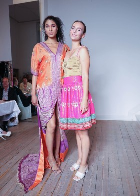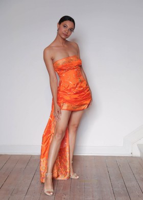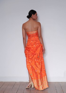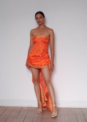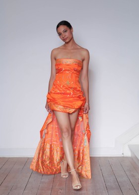 Dieser Rock ist aus kunstvoll bestickter Seidenware gefertigt und Teil der Couture Edition. Ein besonderer Hingucker ist die breite, zweifarbige Bordüre am Saum des Rockes, welches mit goldenen Perlen und Pailletten bestückt ist. Die goldenen Ornamente auf dem pinken, halbtransparenten mit gleichfarbigen Blüten bestickten Seidenstoff sind ebenfalls ein hervorstechendes Detail. Durch das sonnengelbe Duchesse Futter erhält der Rock den Reiz des orange-pink Effektes. Der Rock betont durch den breiten, hohen Bund Ihre Taille vorteilhaft. Der ausgestellte Schnitt sorgt für ein schönes Volumen. Komplettieren Sie Ihren Look mit unserem drapierten Top aus glänzendem Gold-Jersey mit pinken Seidenträgern.