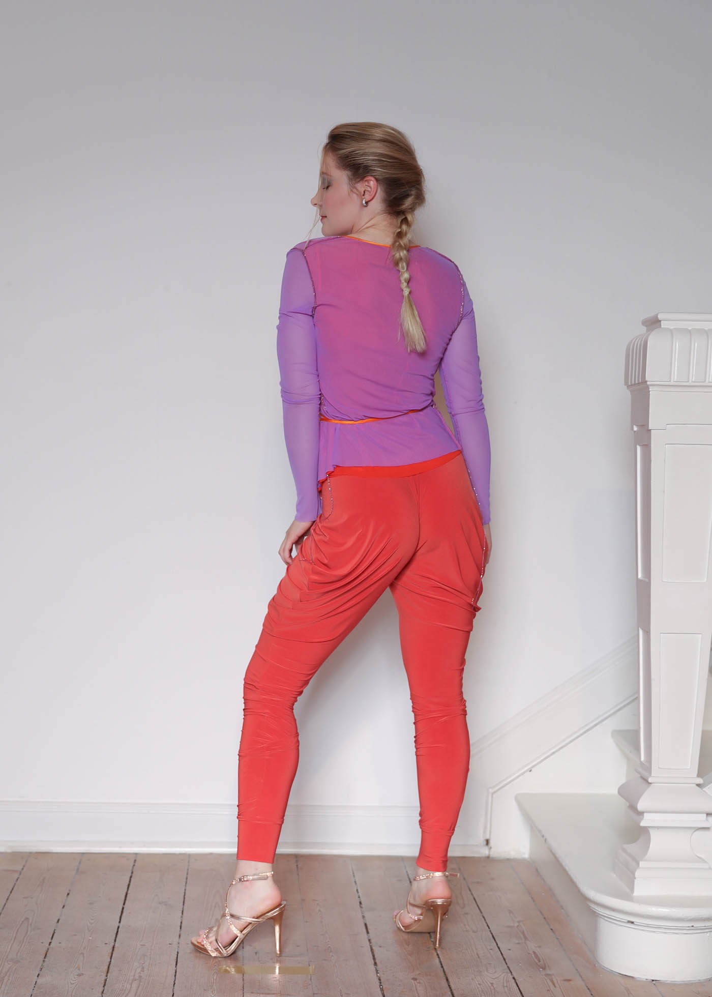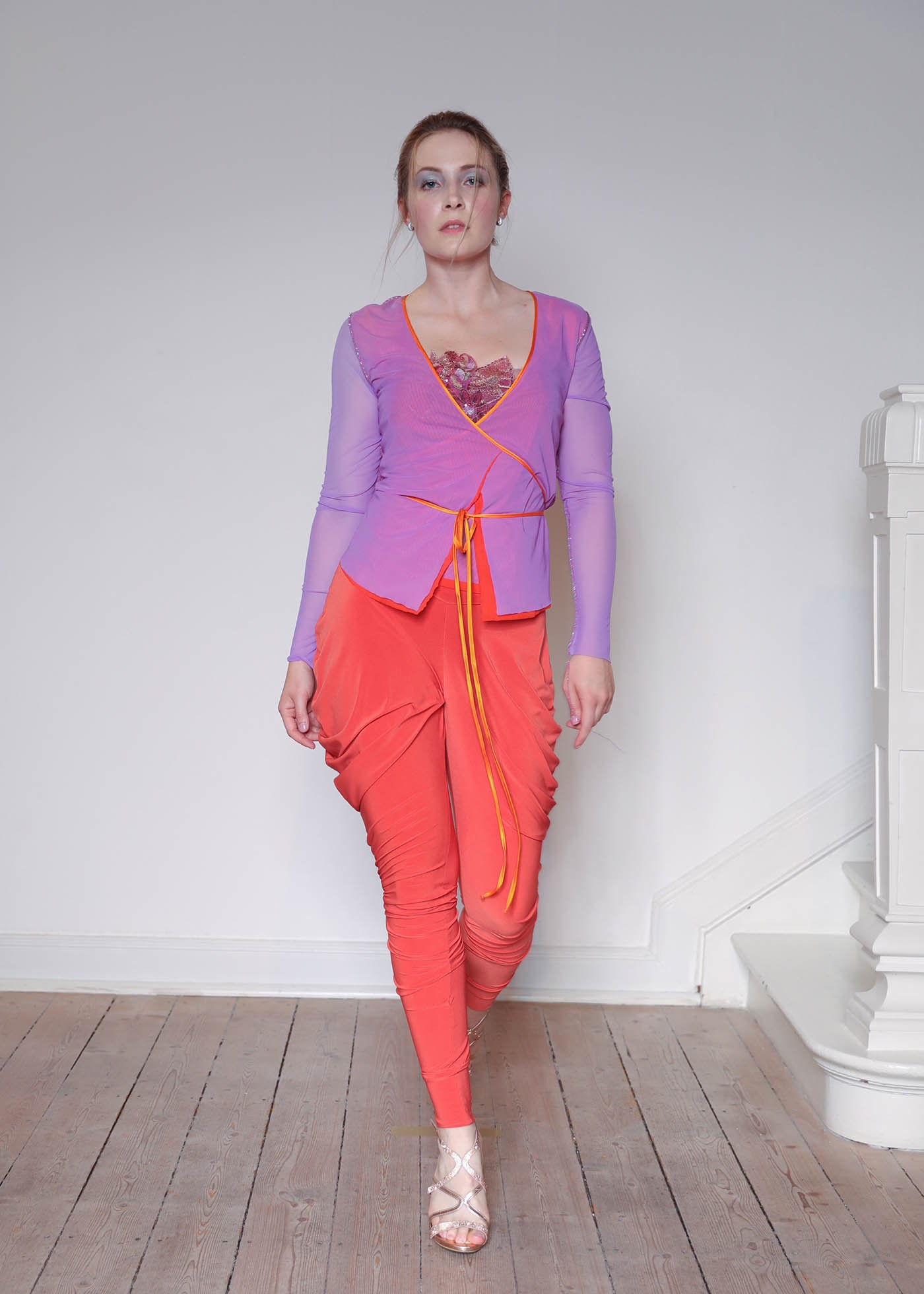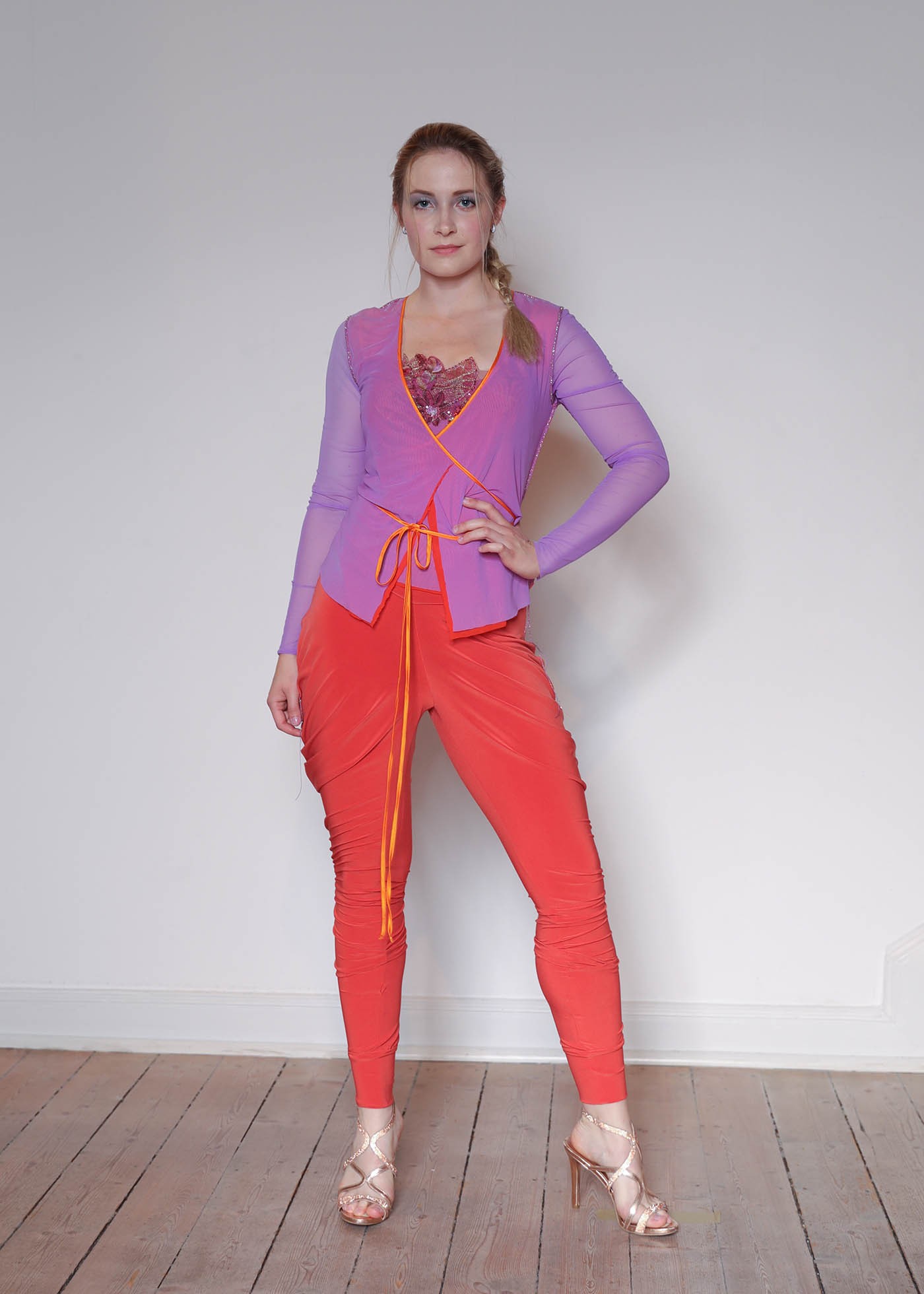 Top mit floraler Spitzenapplikation aus doubliertem Tüll in violett-orange