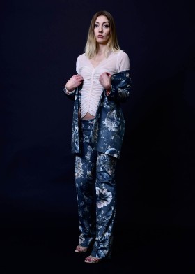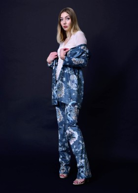 Diese elegante High Collar Jacke ist ein echtes Statement-Piece. Die puristisch geschnittene Jacke verzaubert besonders durch ihre Materialität - der hochwertige, mittelschwere Samt ist mit einem kunstvollen Print in Pastell- und Meerestönen verziert, der sich aus japanischen Koi und Kirschblüten Motiven zusammensetzt. Das pfirsichfarbene, leuchtende Satinfutter sorgt für zusätzlichen Tragekomfort. Kombinieren Sie die Jacke mit unserer passenden Samthose, um einen atemberaubenden Samtanzug zu kreieren, der Eleganz und Modernität mit einem Hauch von Extravaganz vereint. Zu dem Samtanzug harmoniert besonders gut unser gerafftes Tüllstretch Shirt in ivory. Mit dieser Kombination ziehen Sie bei der nächsten Abendveranstaltung garantiert alle Blicke auf sich. Für einen besonderen Anlass können Sie zu der Jacke alternativ unser Tulip Dress wählen, welches ebenso aus dem hochwertigen Samtstoff besteht. Wählen Sie im Alltag zu der Samtjacke eines unserer Tüllstretch Shirts und eine Pure Jersey Pants. Die Jacke wird ihrem Outfit stets eine besondere Note verleihen.