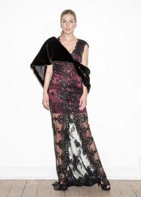 Das Black Mermaid Cocktail Dress verzaubert durch seinen irisierenden, schillernden, lackierten Schuppenprint, der von der Flosse einer Meerjungfrau inspiriert ist. Das figurbetonte, langärmelige Kleid bietet auf Grund seines four-way elastischen Materials einen hohen Tragekomfort. Ein besonderes Detail sind die schwarzen Couture-Spitzen Kanten mit Blüten- und Paillettenstickereien, die den Saum und die Ärmel des Kleides verzieren. Der V-Ausschnitt betont das Dekolleté vorteilhaft. Die Rocco Ärmel sorgen für eine verspielte Note. Das Kleid eignet sich hervorragend für besondere Anlässe. Komplettieren Sie Ihren Look mit hohen schwarzen Schuhen und unserer veganen Fell-Stola.