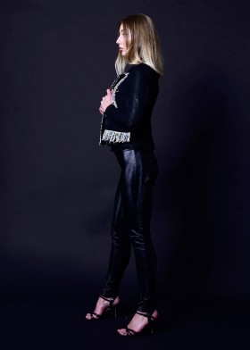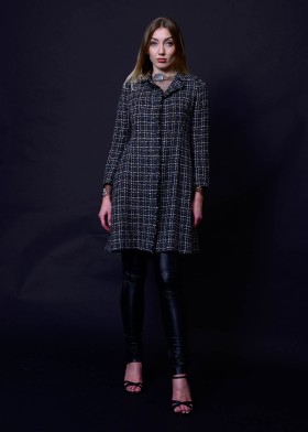 Das hochwertige Tweedgewebe setzt sich aus verschiedenen Blau- und Grautönen sowie ivory farbenen Akzenten und silbernen Lurexeinwebungen zusammen. Der Schalkragen verleiht dem Mantel eine lässige Note. Der Tweedmantel verfügt über seitliche Eingriffstaschen. Das hochwertige silberne Satinfutter sorgt für zusätzlichen Tragekomfort.