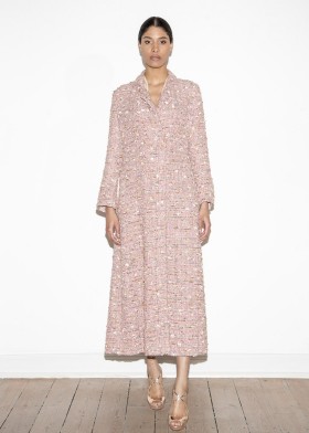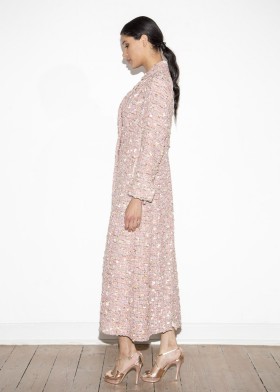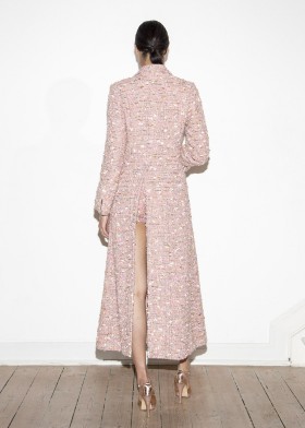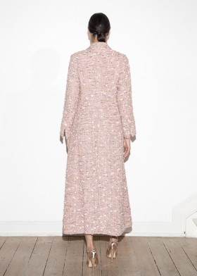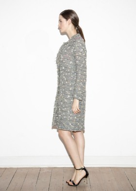 Janina trägt einen knieumspielenden A-Linien-Mantel aus zartem Bouclé-Tweed in feinen Mélange-Grüntönen – ein elegantes Statement-Piece mit Dreiviertelärmeln und klassischem Spartenkragen. Der strukturierte Stoff verleiht dem Look Raffinesse und einen Hauch von Retro-Charme. Dazu kombiniert sie eine passende, hochgeschnittene Shorts mit frontalem Reißverschluss sowie ein zartes, doppelt gearbeitetes Tüll-Stretch-Shirt in Ivory. Der U-Boot-Ausschnitt und die silbernen Lurex-Nähte verleihen dem Look einen subtilen Hauch von Glamour.