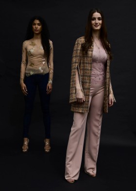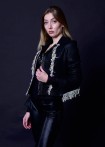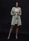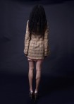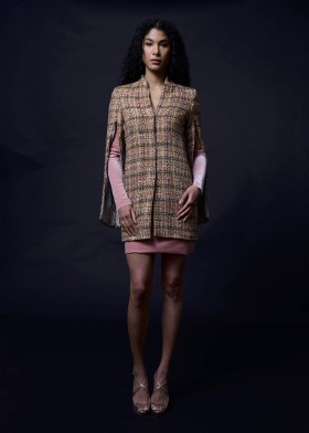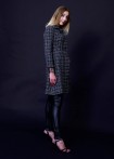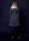 A-coat with spade collar made of tweed with black, gray, purple, blue and silver weaves and concealed press stud placket with fringes