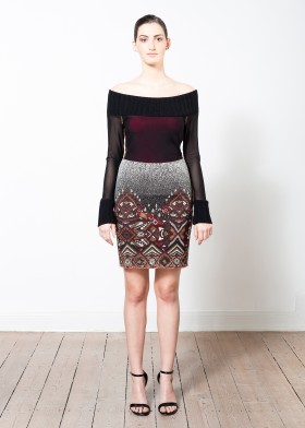 Form-fitting jacquard jersey mini skirt with Mayan motifs