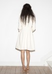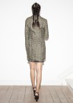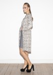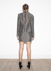 Short cut jacket made of gray wool stretch with golden pinstripes, a cut stand-up collar and puff sleeves