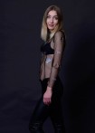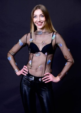 Semi-sheer shirt with long puff sleeves, high neck and opulent, multi-fabric lace and underlay with bustier top
