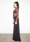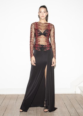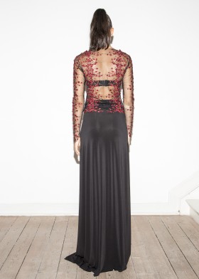 Vanilla blossom dress underlaid with sand-colored satin stretch and delicate, transparent shoulder section