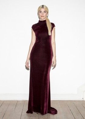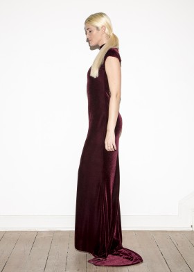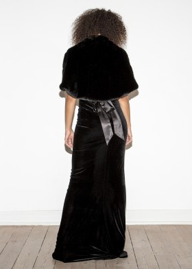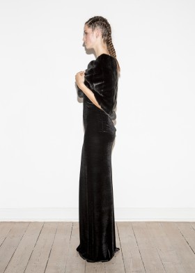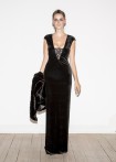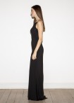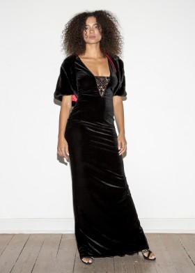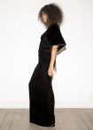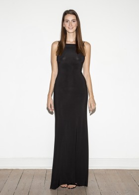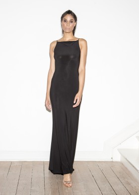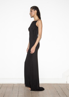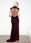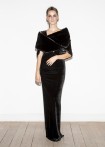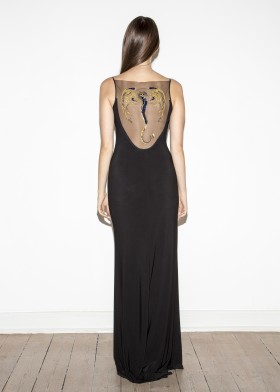 Floor-length, black evening dress with a deep, extravagant back neckline, decorated with decorative dragon appliqué