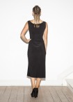 Sleeveless, black crêpe jersey dress with multicolored decorative collar, gathering and high leg slit that wraps around the knee