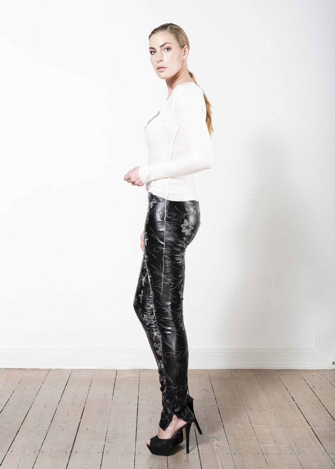 A glam piece for many occasions! This stretch jersey shirt stands out with sophistication thanks to its glamorous necklace embroidered with rhinestones at the neckline. Whether worn plain in white with a satin push-up or with different colored bottoms for a bi-colour effect, this shirt offers you many styling options.