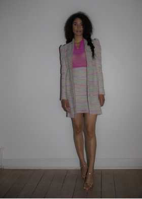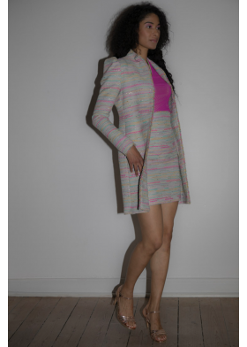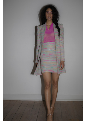 The short, narrow tweed skirt is a timeless classic. The cut emphasizes your figure. The high-quality tweed with bouclé elements combines twelve different shades to create a harmonious overall look. The bright pink satin stretch lining is a beautiful detail. For the perfect business outfit, choose the combination of our matching tweed coat in grey and our shirt with a flower and pearl necklace or matching turtleneck shirt.