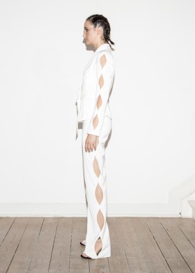 White blazer with transparent ellipse cut-outs on the arms, shawl collar and tie belt