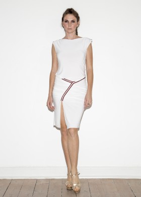 Gathered, short, sleeveless crêpe jersey dress with a leg slit and asymmetric, two-tone stripe appliqué