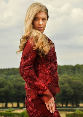 3D jacket with decorative ornamental embroidery in bordeaux red