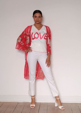 This extravagant pink silk chiffon kimono forms part of our Limited Couture Edition. You will be impressed with the look and feel of the semi-transparent fabric and gold lurex seam detail. This investment piece is versatile enough for both every day and occasion wear. Combine with our ⅞ white jeans and Love Shirt for a sophisticated dinner date or with our Pure Pants and long sleeved Rita Lagune logo shirt in stretch tulle. Worn with your favourite white dress it is the perfect look for your next summer holiday.