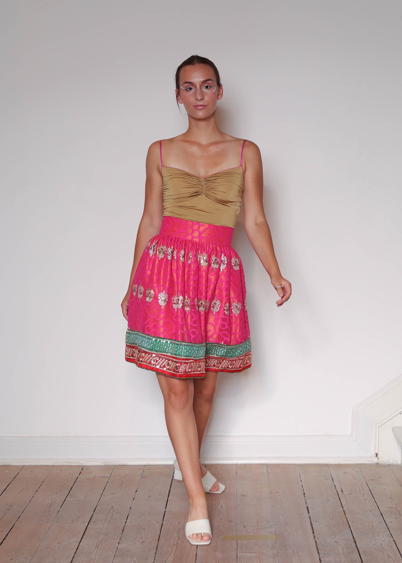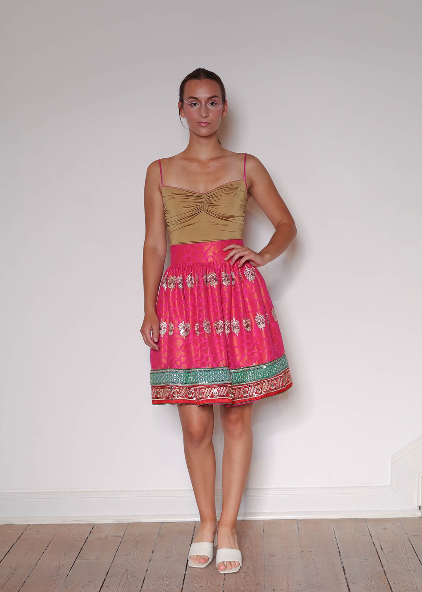 This skirt made from artfully embroidered silk fabric is part of the Limited Couture Edition. The wide 2-colour border at the hem is decorated with golden beads sequins. The pink, semi-transparent silk fabric embroidered with flowers in the same colour and golden ornaments are another striking detail. The sunshine yellow Duchesse lining creates a charming orange-pink effect. The wide, high waistband and flared cut create a flattering waistline. Complete your look with our draped top in shiny gold jersey with pink silk straps.