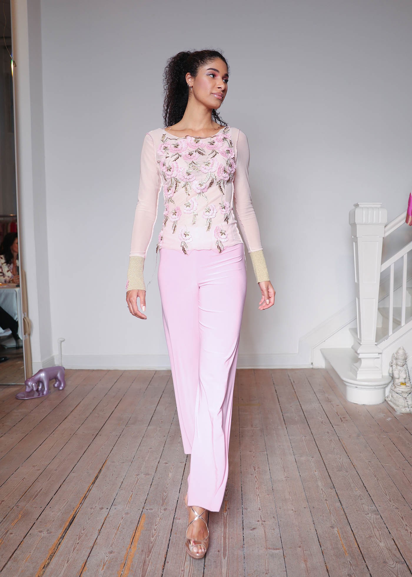 The classic cut of these loose leg jersey trousers in strong pink harmonises particularly well with our fan lace shirt with gold cuffs. Alternatively, wear the trousers with one of our classy embroidered lace shirts or one of our turtleneck shirts. With their simple, elegant style, the pants go with countless tops and are very comfortable to wear thanks to the stretch jersey fabric. The jersey pants are also perfect for a day at the home office. Suitable for suitcases and travel.