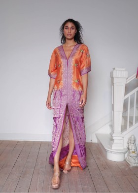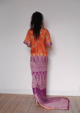 This high-waisted skirt will win you over with its timeless elegance and high-quality material. The stretch wool satin in ivory gives the skirt a luxurious look and also makes it comfortable to wear. The cut emphasizes your waist and creates a feminine silhouette. The highlight of this skirt is undoubtedly the sophisticated godet slit with a sari insert made from intricately embroidered silk chiffon with a border. This detail adds a touch of exoticism and extravagance. The Italian length of the skirt gives it a timeless aesthetic. Combine the skirt with our basic shirt in soft olive for a day at the office. Choose one of our elegant lace shirts for an evening event.