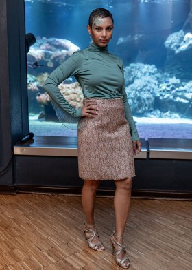The Black Mermaid Cocktail Dress enchants with its iridescent, shimmering, lacquered scale print inspired by a mermaid's fin. The figure-hugging, long-sleeved dress is extremely comfortable to wear thanks to its four-way stretch material. A special detail are the black couture lace edges with floral and sequin embroidery that decorate the hem and sleeves of the dress. The V-neckline emphasises the décolleté. The Rocco sleeves add a playful touch. The dress is perfect for special occasions. Complete your look with high black shoes and our vegan fur stole.