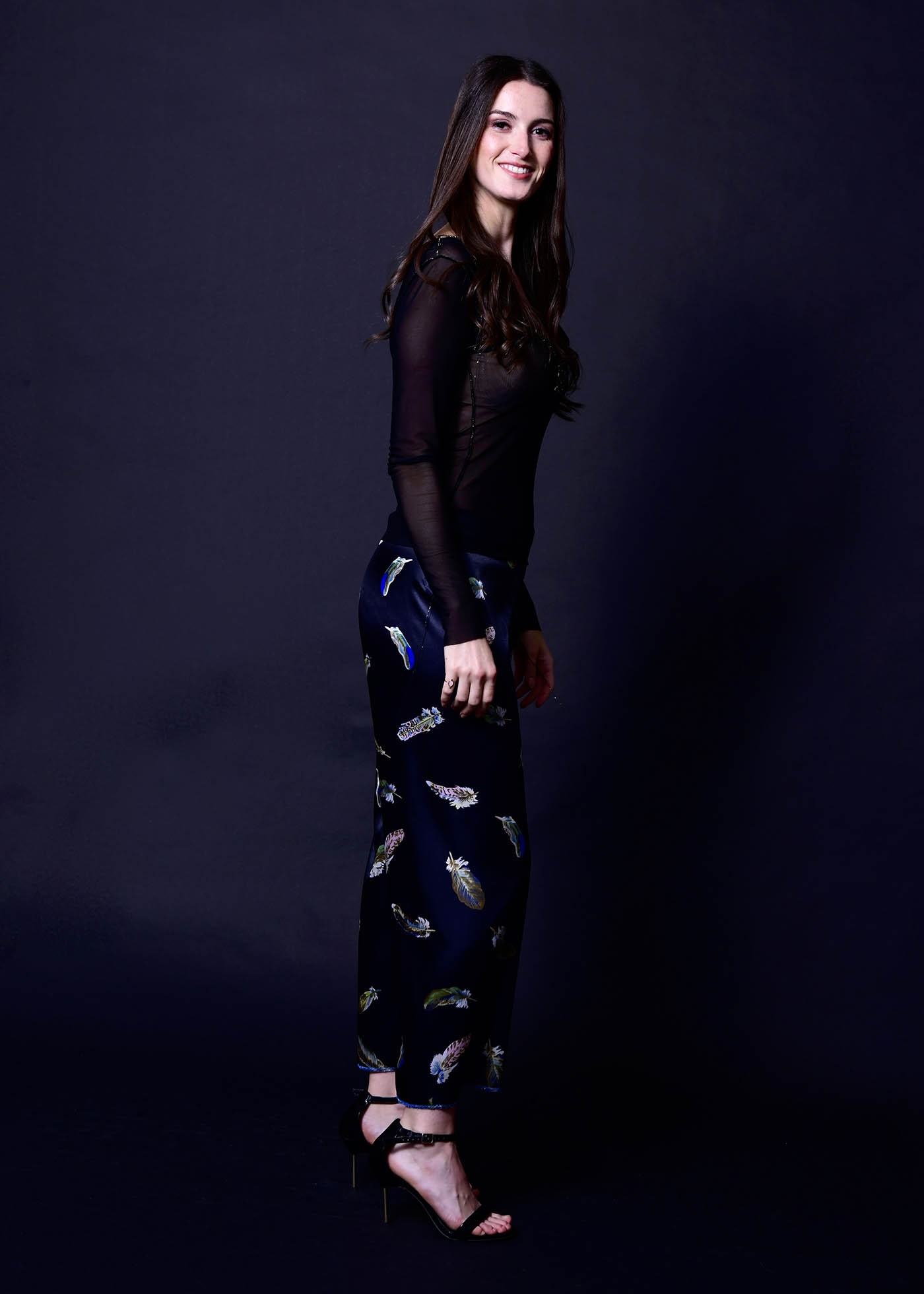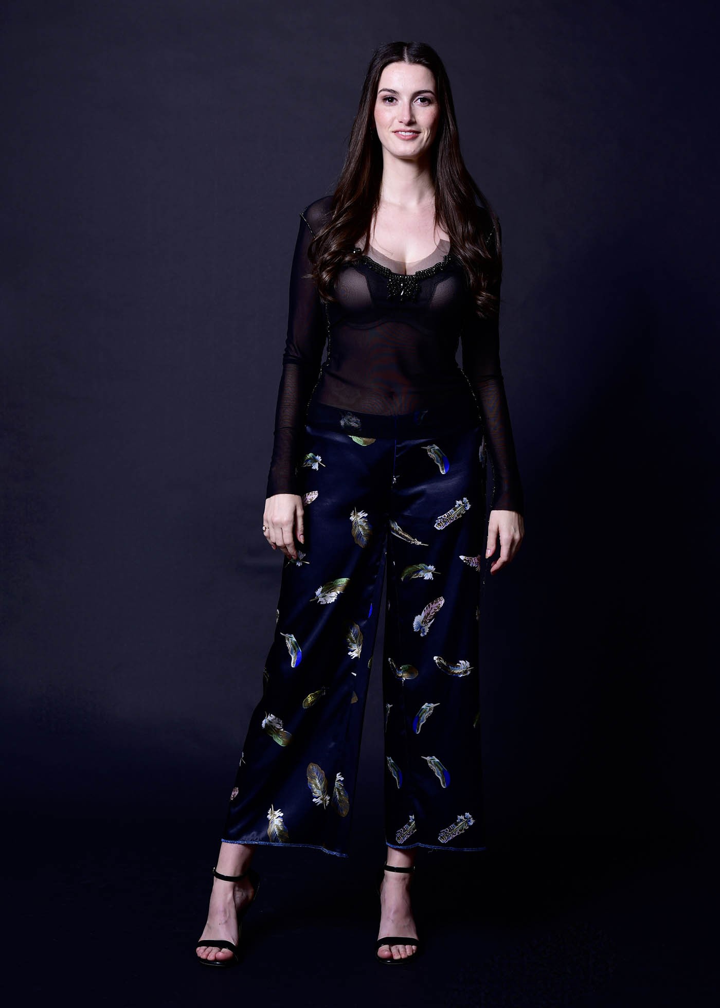 The feather print trousers are sure to quickly become your new favourite item of clothing, as they skilfully combine elegance and comfort. The trousers are decorated with an enchanting, multicoloured feather print, which gives the trousers a playful nuance. The loose cut creates a casual yet sophisticated silhouette. The luxurious black satin material gently envelops the skin and creates a sophisticated sheen. The waistband of the trousers is piped with bright blue satin. The hem is adorned with the label's signature lurex stitching. Combine the trousers with our tulle stretch logo shirt, a tweed jacket and high heels in black or metallic tones for a casually elegant look. Whether for a relaxed day in the city or a festive occasion - these trousers are versatile.